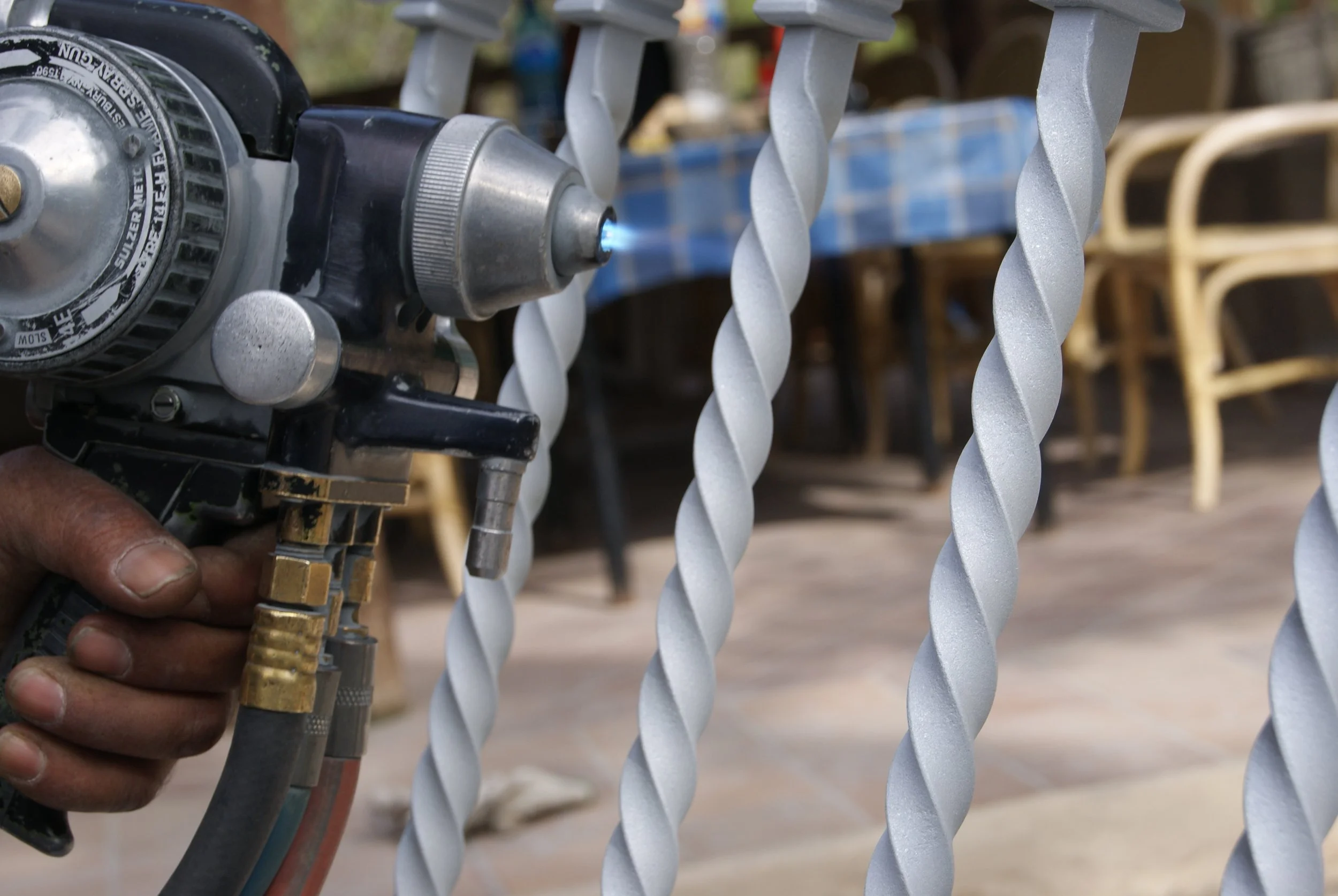 También conocido como proyección térmica o galvano-proyección, el proceso consiste en aplicar una capa de zinc, aluminio o cobre fundido sobre la superficie previamente preparada mediante limpieza, arenado o desengrase, logrando una unión compacta y duradera.